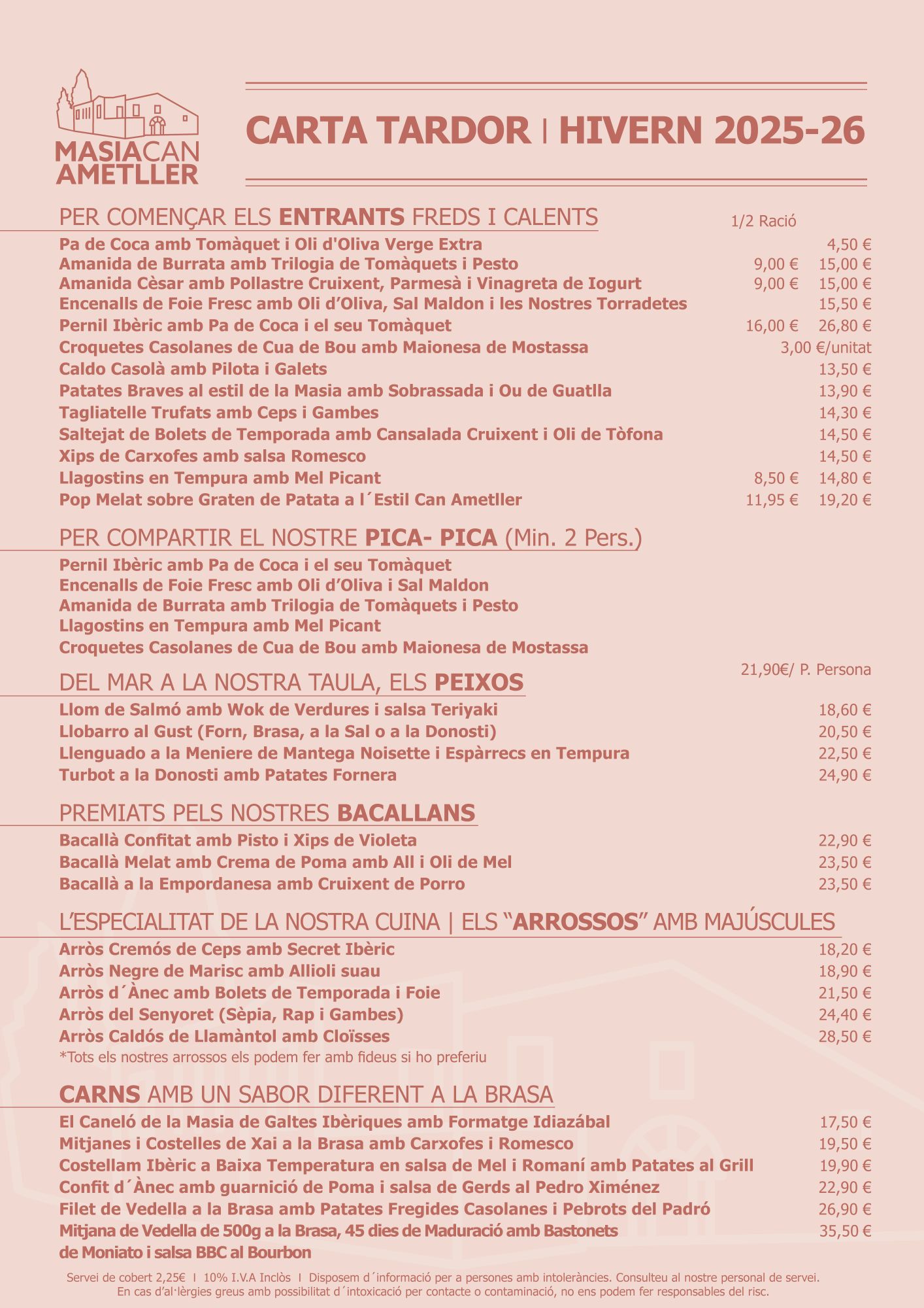 A continuació us presentem la Carta del Restaurant Masia Can Ametller, triada, preparada, el·laborada i perfeccionada per els nostres Xefs. Estarem encantats que vingueu a degustar les seves creacions. Descobriu a la carta del restaurant Masia Can Ametller els plats tradicionals de la cuina mediterrània, en general, i de la cuina catalana en particular. A banda de la carta, sempre podreu gaudir de les propostes de temporada que els nostres Xefs preparen cada setmana.